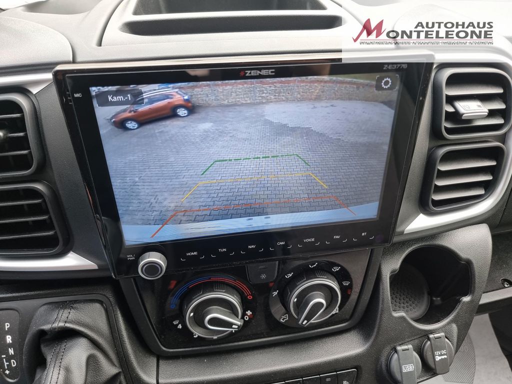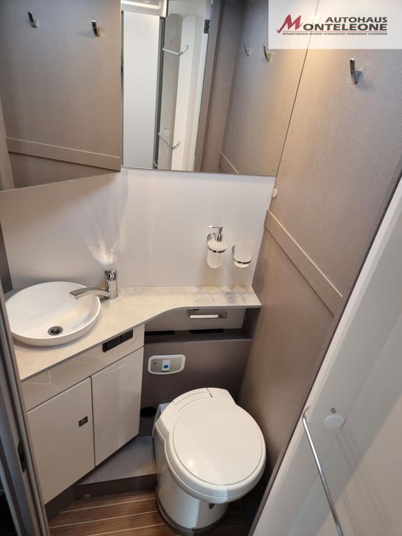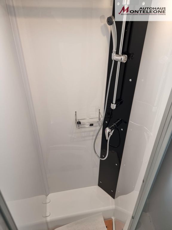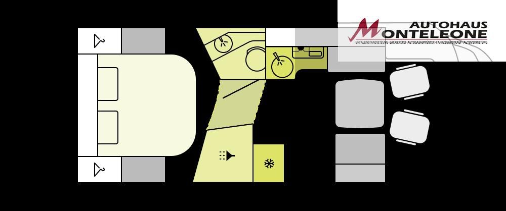 Spiegel mit indirekter Beleuchtung und Garderobenhaken, Holzlattenrost in der Dusche, Fahrerhaussitze inkl. Wohnraumbezügen, Steckdose im Küchenblock, Steckdose in der Garage