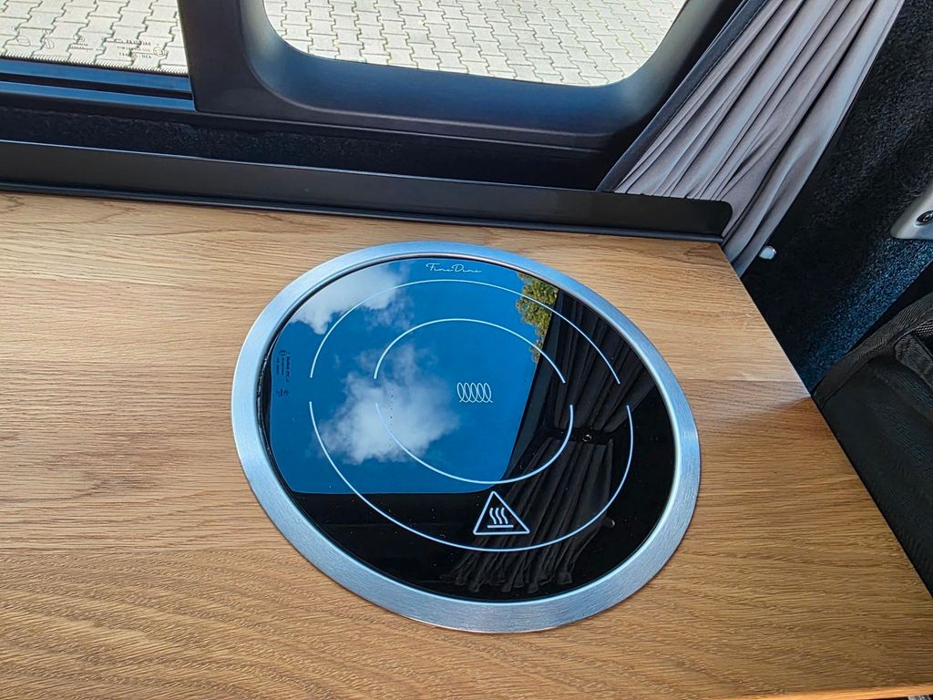 - Küchenblock mit integriertem Spülbecken, Induktionskochfeld und mobiler Gaskartuschenkocher.