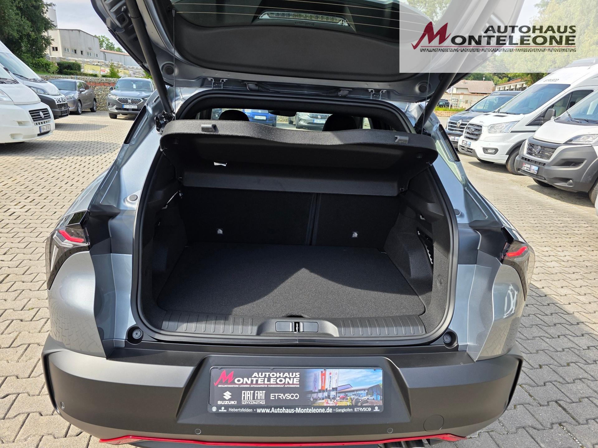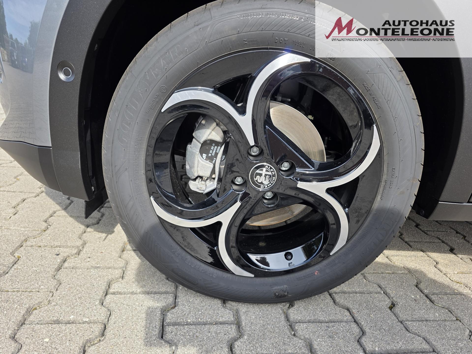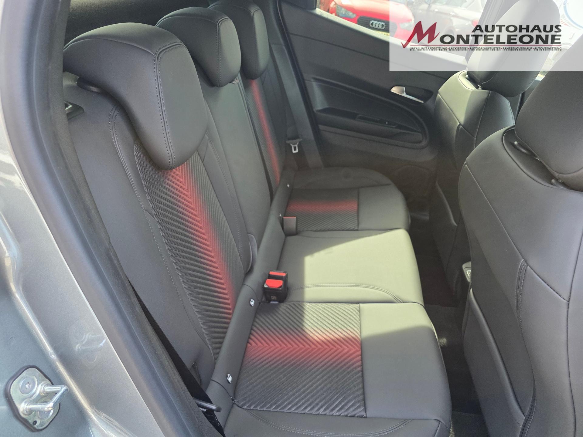 0XR Verkehrszeichneninformation (TSI)132 Mittelarmlehne vorne140 Klimaautomatik182 Kopfstützen vorne höhenverstellbar253 Frontscheibe beheizbar, im unteren Bereich der Wischblätter256 3-Fach verstellbarer Kofferraumboden2UE Schaltwippen hinter dem Lenkrad320 Lenkrad unten abgeflacht, mit Leder bezogen347 Regensensor3IG Fensterheber elektrisch, vorne und hinten412 Adaptive Cruise Control (ACC)42A Vorbereitung Stauraum für Reifenreparaturkit4SU Eloxierte Bremssättel508 Parksensoren hinten mit akustischer Warnmeldung und Anzeige5J1 Stoßfänger, Seitenschweller und Radkasten: in matt Schwarz mit roten Akzenten60D "SPIGA"-Sitze in Stoff/Kunstleder, Vordersitze beheizbar, Fahrersitz el. verstellbar mit Massagefunk61A Türgriffe in Wagenfarbe853 Bedienungsanleitung in Deutsch88Q Außenspiegelkappen schwarz lackiert9JH Garantieheft Deutschland9S8 Kollisionswarnsystem (FCW) mit autonomer Notbremsfunktion (AEB)9YN 180° Rückfahrkamera mit dynamischen Führungslinien9YZ Spurhalte- und Stauassistent (TJA + LC)9Z0 Schlüsselloses Ent- und Verriegelungssystem (Keyless Entry)B91 Scudetto (V-Grill) "Leggenda"CFN Rücksitzbank asymmetrisch geteilt und umklappbar (60:40)CSM Taschen in den Rückenlehnen der VordersitzeGEG Heckscheibe und hintere Seitenscheiben abgedunkeltGT8 Außenspiegel elektrisch verstellbarGX4 Schlüssellose Motorstart-Funktion mit Startknopf in der MittelkonsoleJAU Digitale Instrumentenanzeige „Cannocchiale“ mit 10,25"-TFT-Farbbildschirm in Full-HDJK2 Elektrische Heckklappe mit Easy-Loading FunktionLAY LED-HeckleuchtenLHA Ambiente-Beleuchtung: Mittelkonsole, seitliche Lüftungsdüsen, Cannochiale (8 Farben einstellbar)LN7 Innenbeleuchtung LED vorne und hinten mit TouchfunktionLPX Voll-LED-Scheinwerfer, inkl. LED-Fernlicht und "3+3"-TagfahrlichtsignaturRCG Hi-Fi Audiosystem mit 6 LautsprechernRDQ Alfa™ Connect 10,25" Infotainmentsystem mit NavigationRS4 USB-Anschluss für die zweite Sitzreihe (Typ C)WP818" Leichtmetallfelge FORI, inkl. Sommerreifen (215/55 R18)XC4 Elektromechanische ParkbremseXG8 Fahrdynamikregelung Alfa™ D.N.A., 3-stufigeinstellbar: Dynamic/Natural/Advanced Efficiency