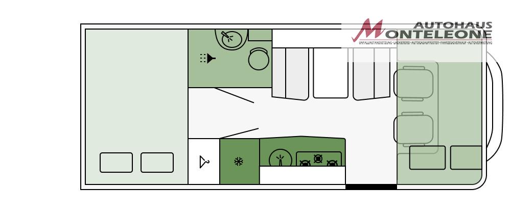 • Großzügige Heckgarage mit Rahmenabsenkung, Verzurrösen und Innenbeleuchtung (modellabhängig) vorhanden