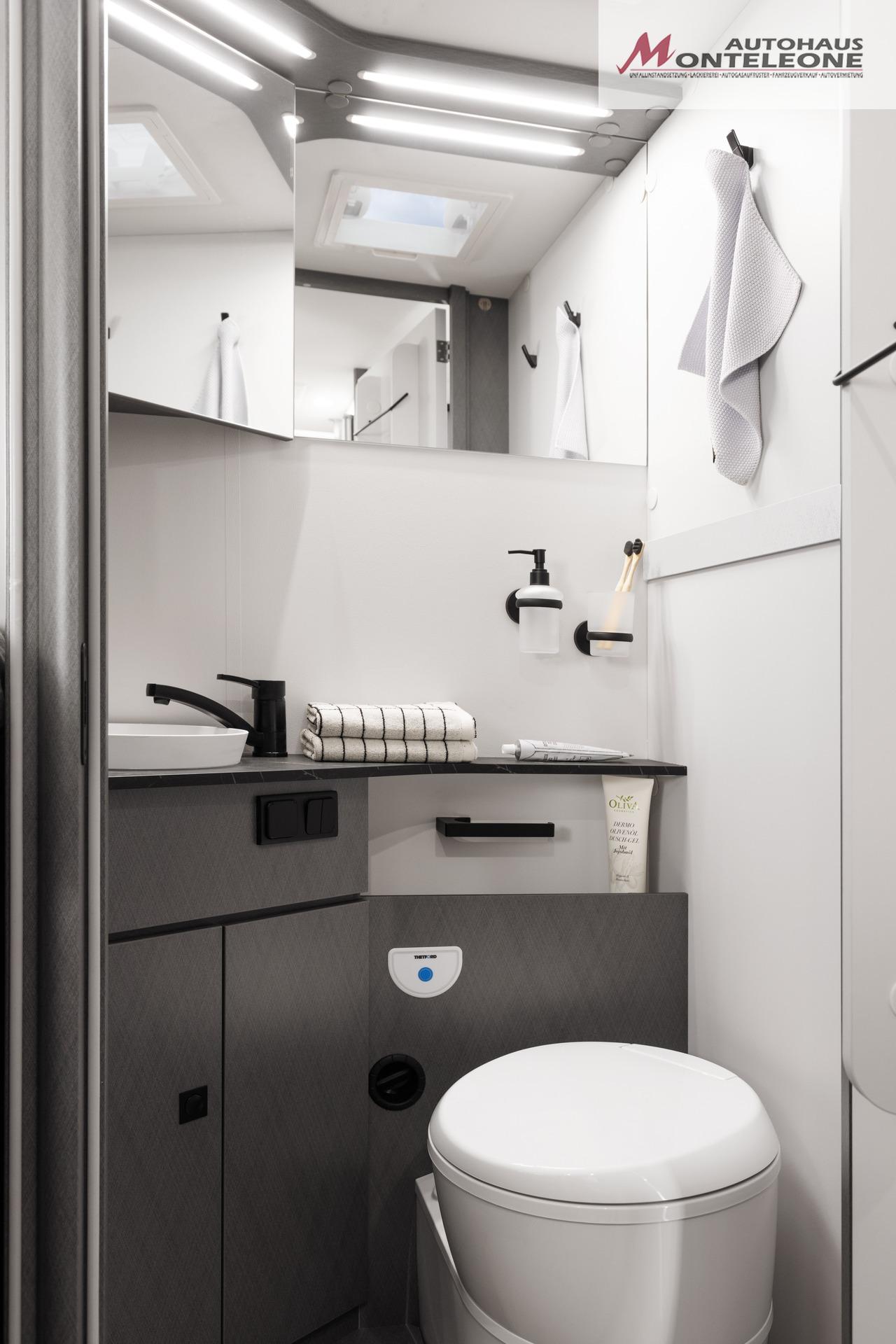 • Kassettentoilette mit elektrischer Pumpe und drehbarem Sitz vorhanden