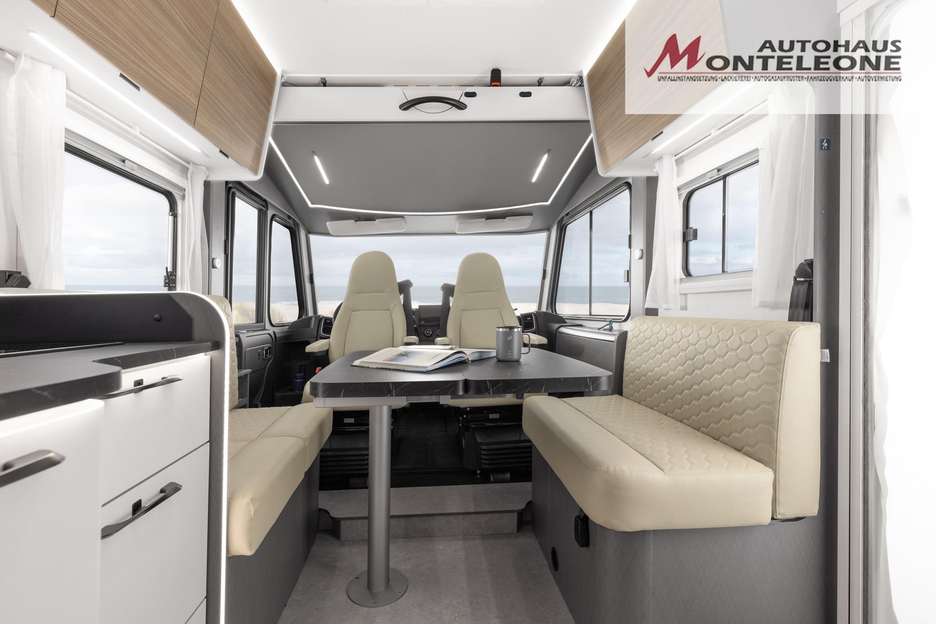 • Großzügige Heckgarage mit Rahmenabsenkung, Verzurrösen und Innenbeleuchtung (modellabhängig) vorhanden