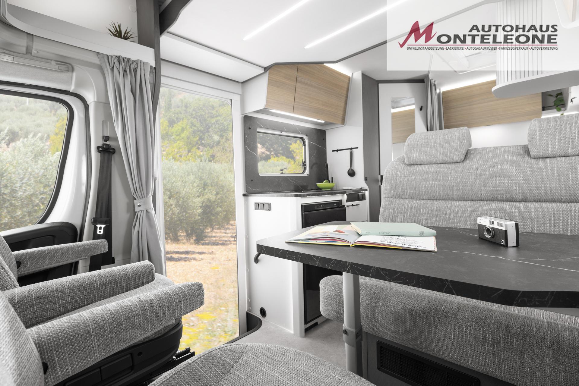 • Großzügige Heckgarage mit Rahmenabsenkung, Verzurrösen und Innenbeleuchtung (modellabhängig) vorhanden