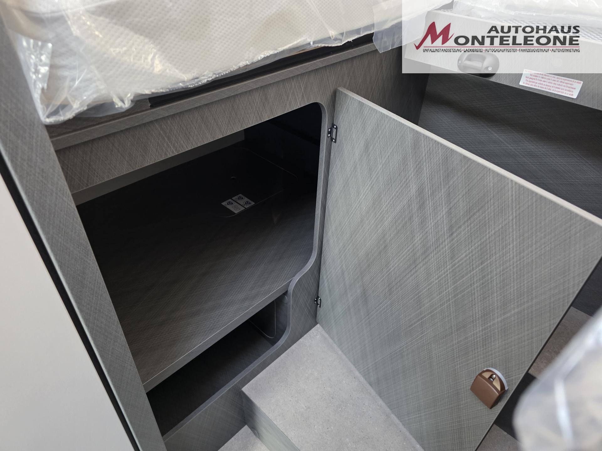 • Großzügige Heckgarage mit Rahmenabsenkung, Verzurrösen und Innenbeleuchtung (modellabhängig) vorhanden