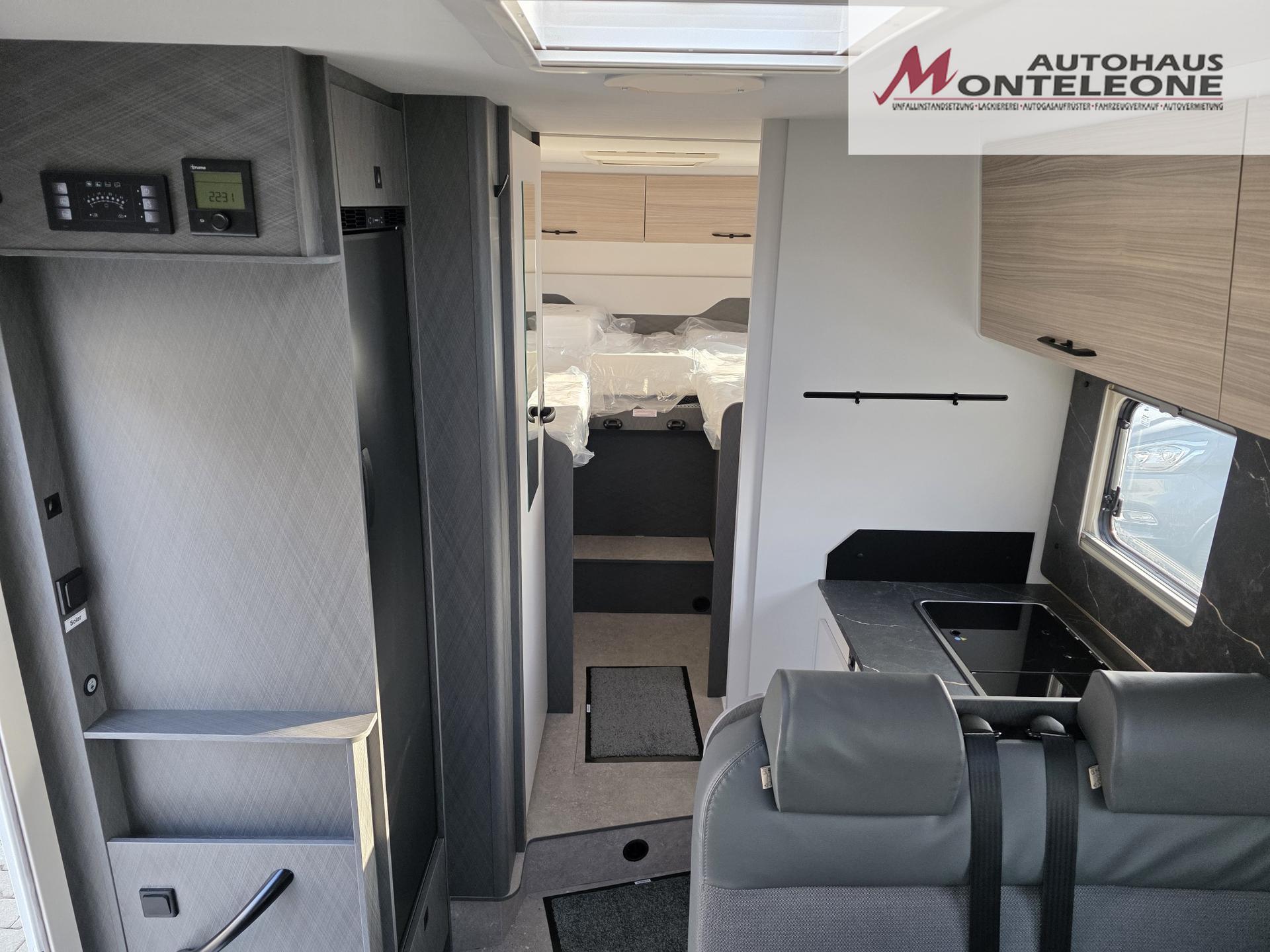 • Großzügige Heckgarage mit Rahmenabsenkung, Verzurrösen und Innenbeleuchtung (modellabhängig) vorhanden