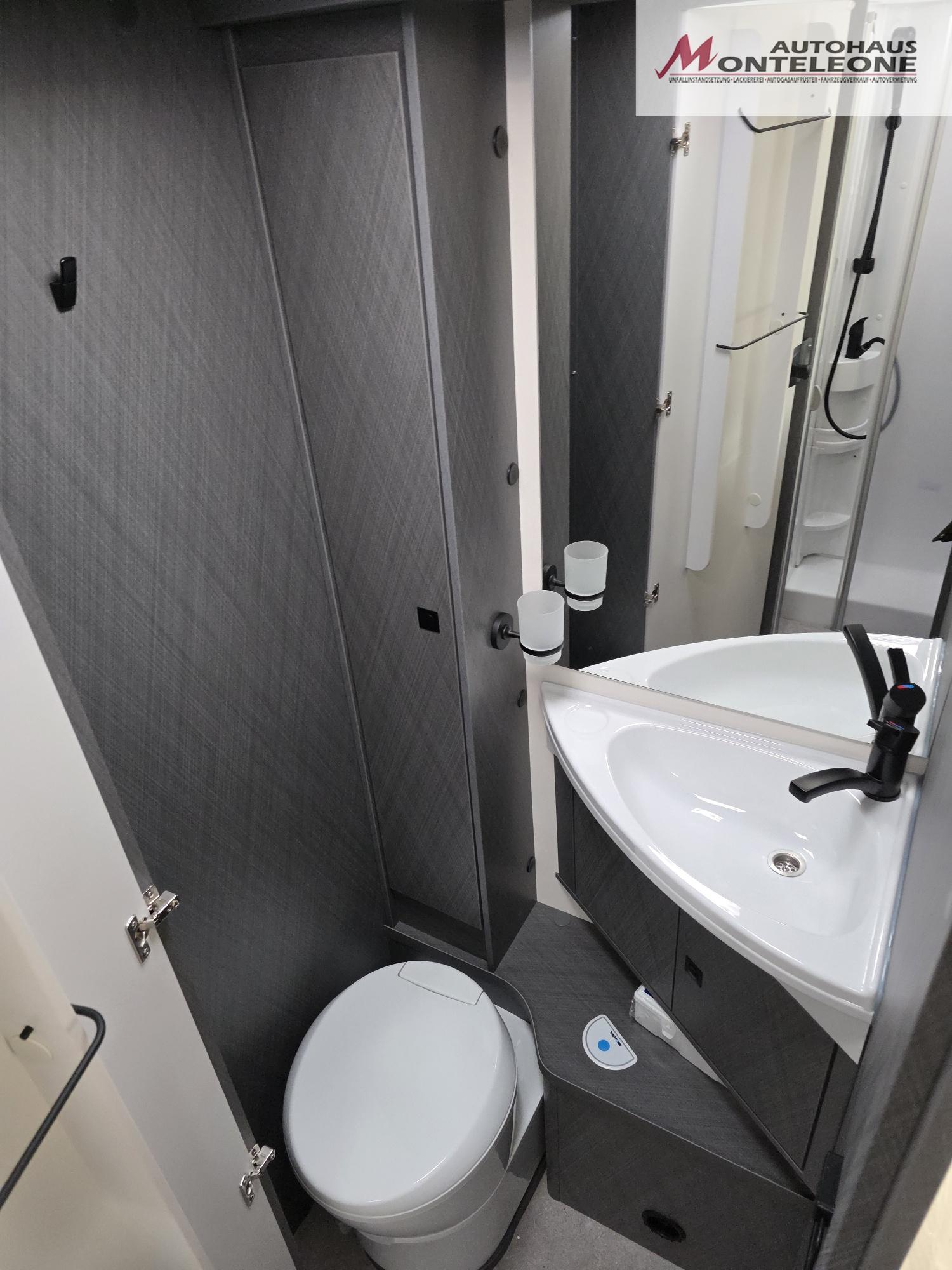• Kassettentoilette mit elektrischer Pumpe und drehbarem Sitz vorhanden