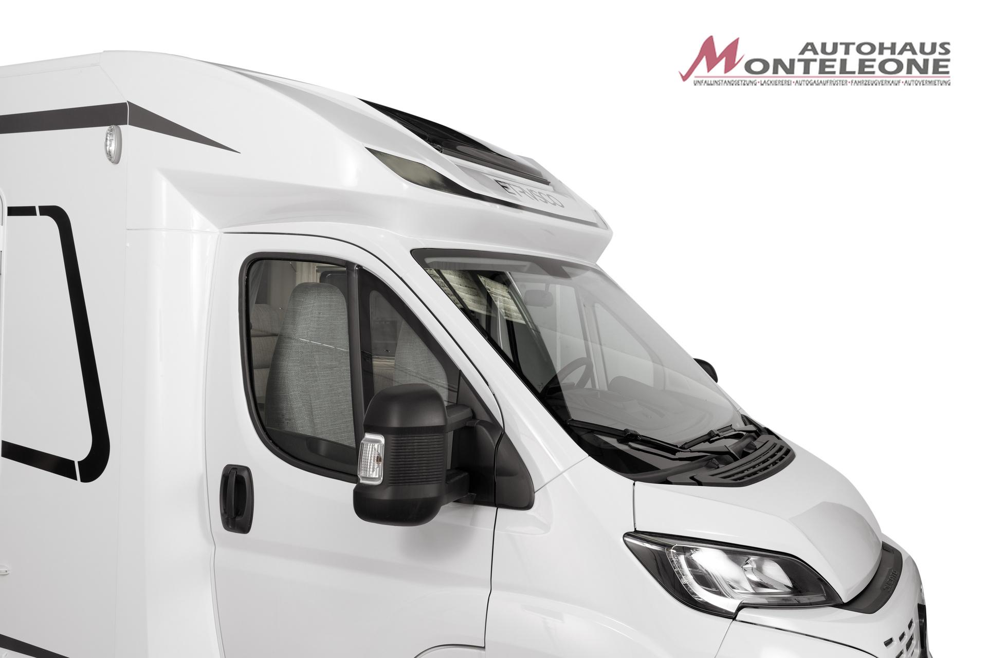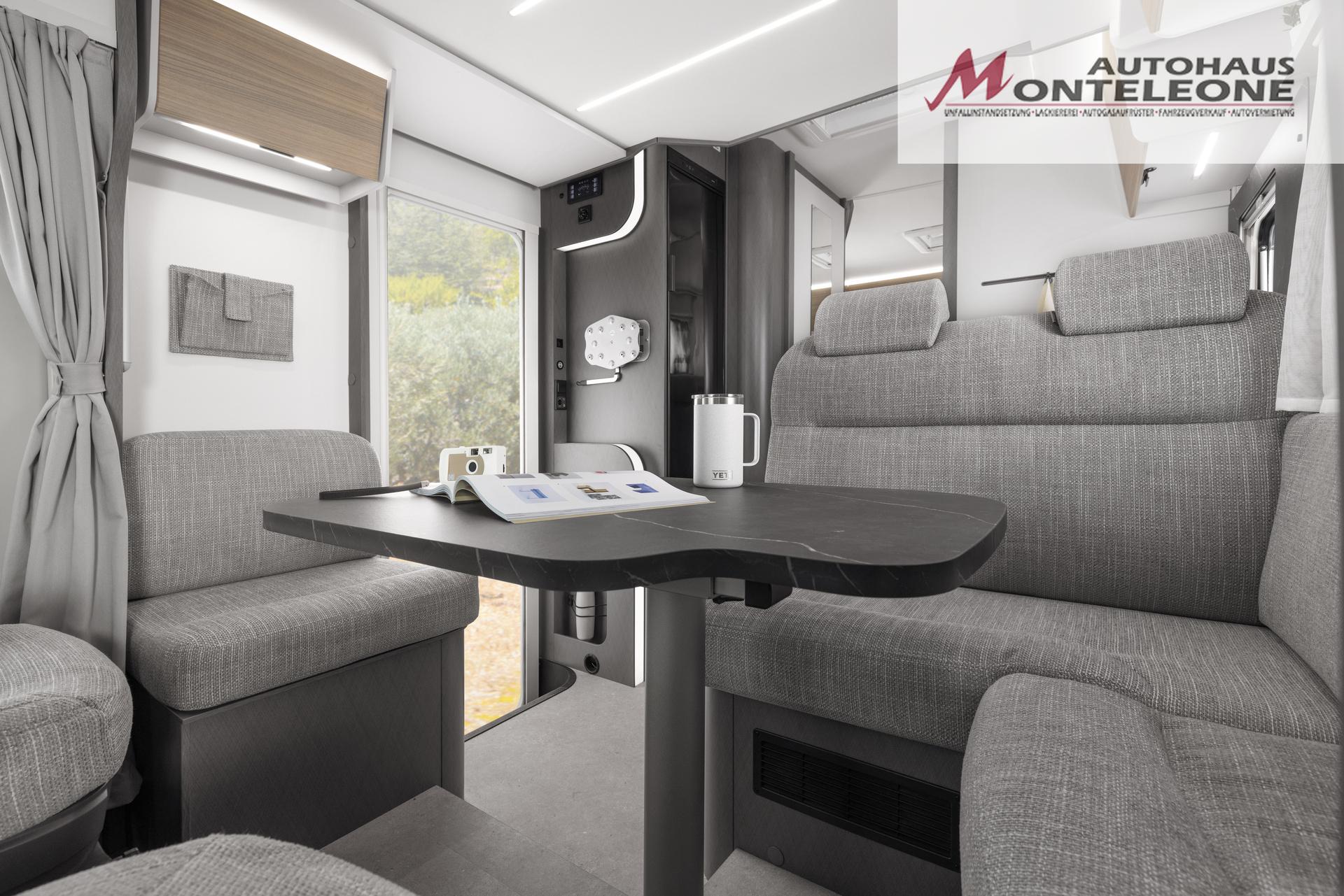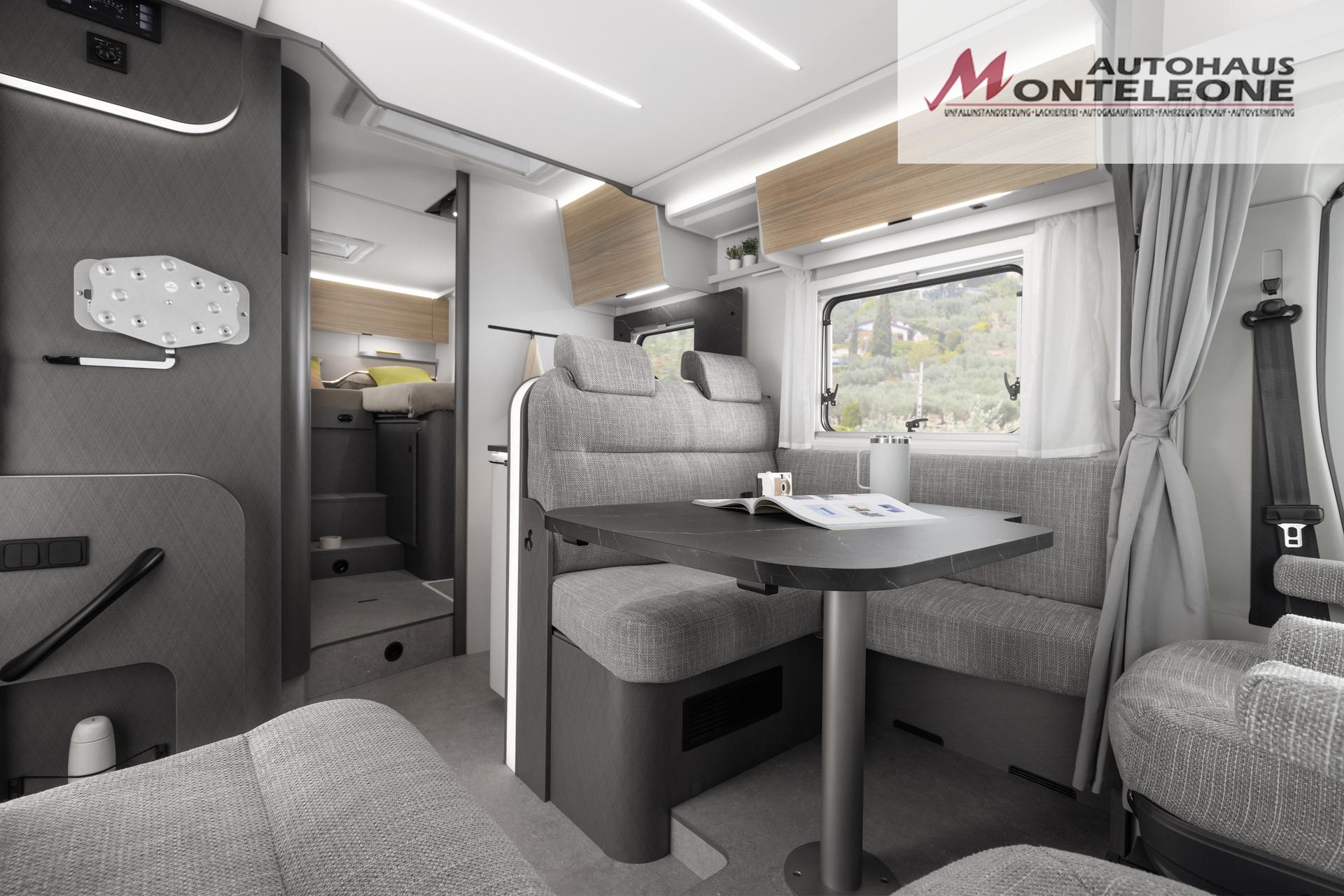 • Großzügige Heckgarage mit Rahmenabsenkung, Verzurrösen und Innenbeleuchtung (modellabhängig) vorhanden