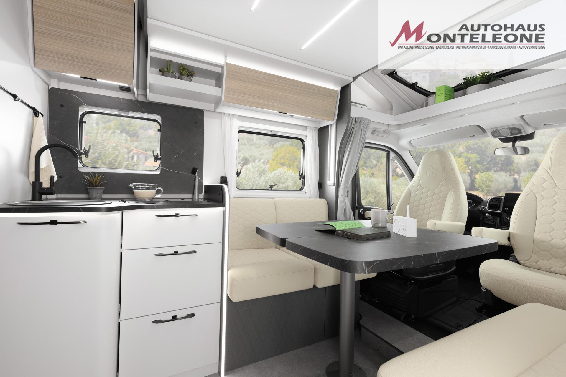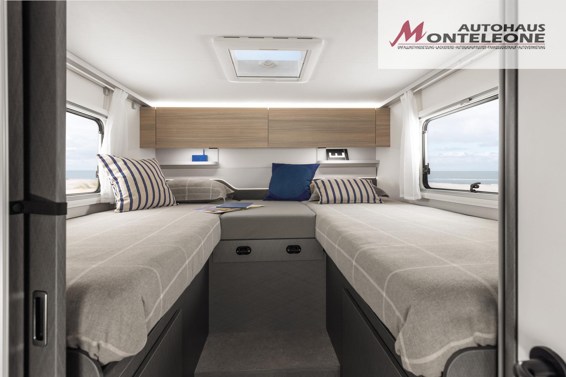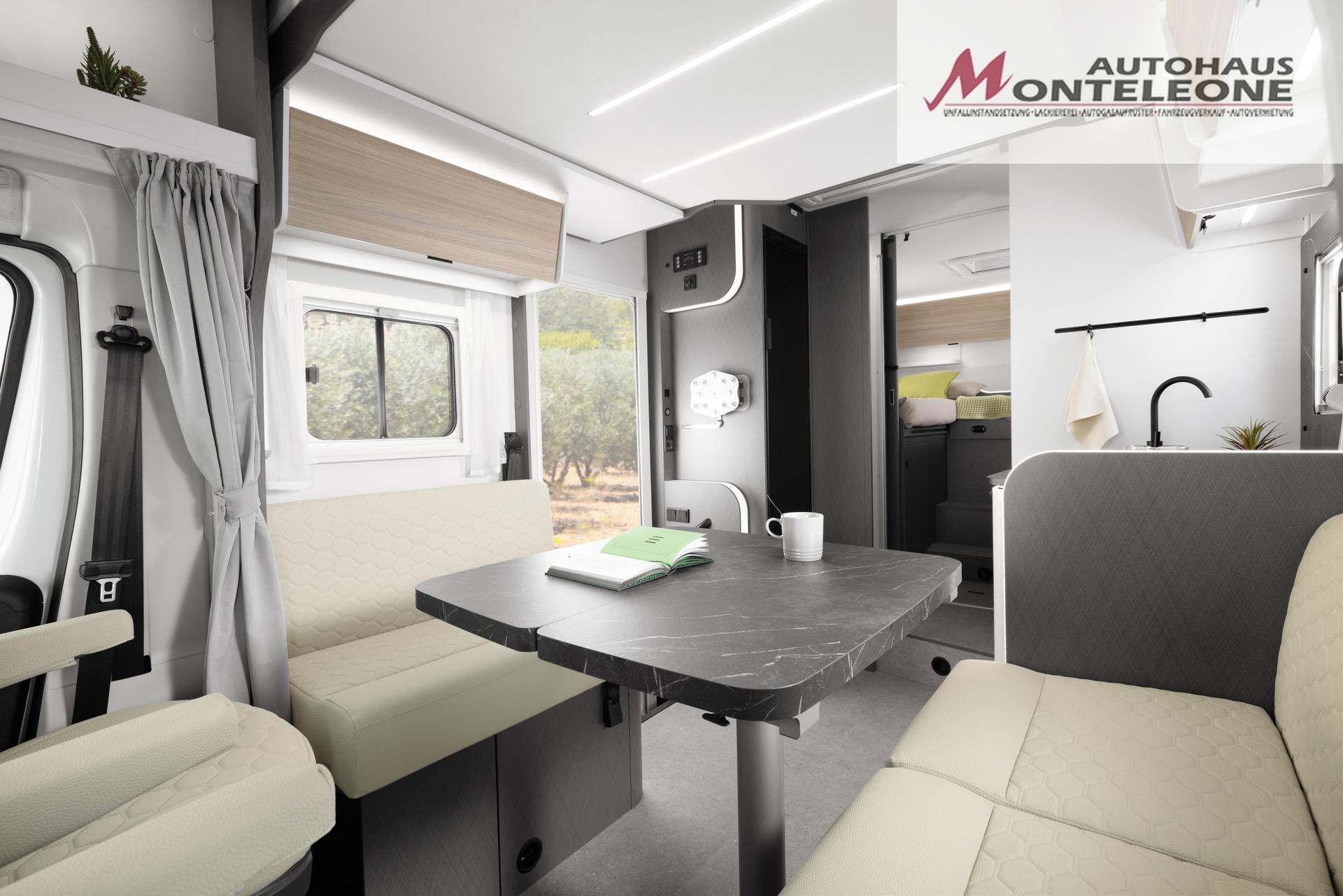 • Großzügige Heckgarage mit Rahmenabsenkung, Verzurrösen und Innenbeleuchtung (modellabhängig) vorhanden