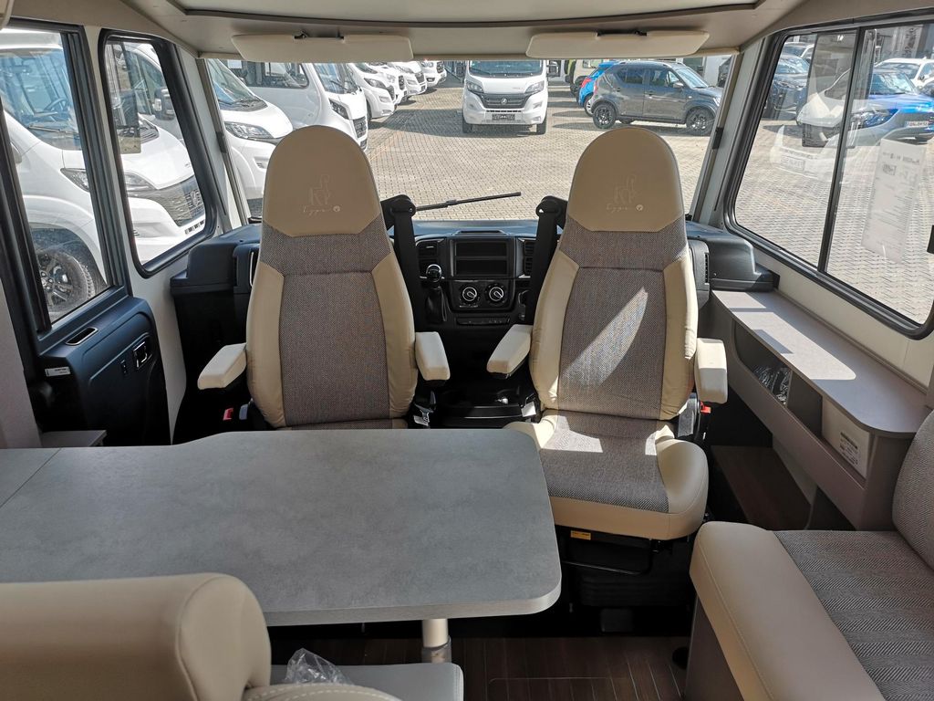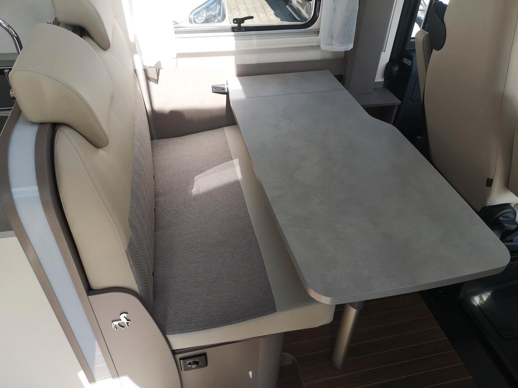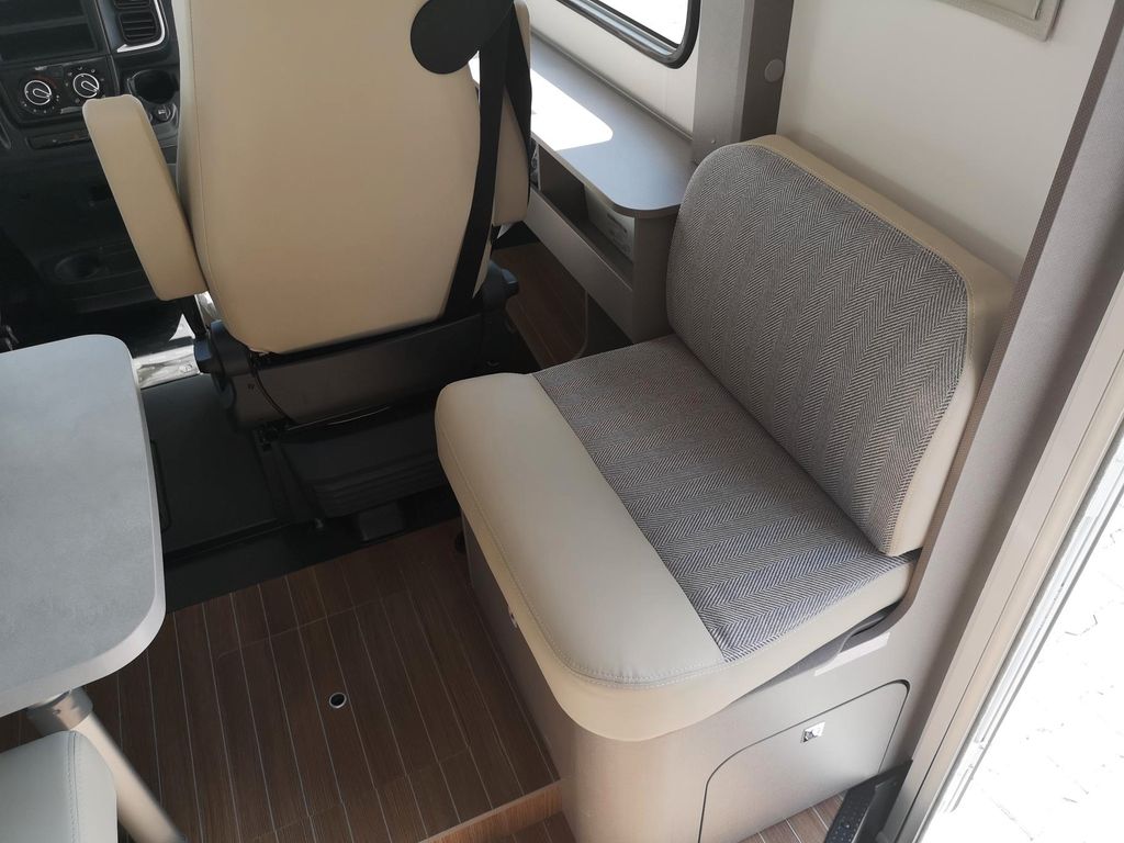 - Fahrer-Beifahrersitz drehbar in Wohnraumstoff mit Doppelarmlehnen